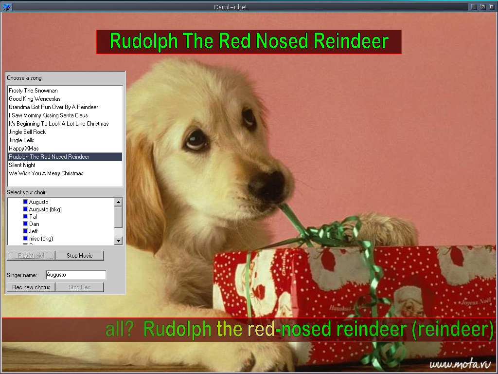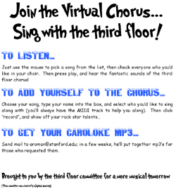 So the Carol-oke software was designed and engineered - primarily by Augusto - to allow users to sing along with MIDI files of Christmas songs. Lyrics are provided, karaoke-style. Each user can record himself, and thus add himself to the virtual choir. Future users can opt to sing along with any subset of previous carol-ers. Good times.