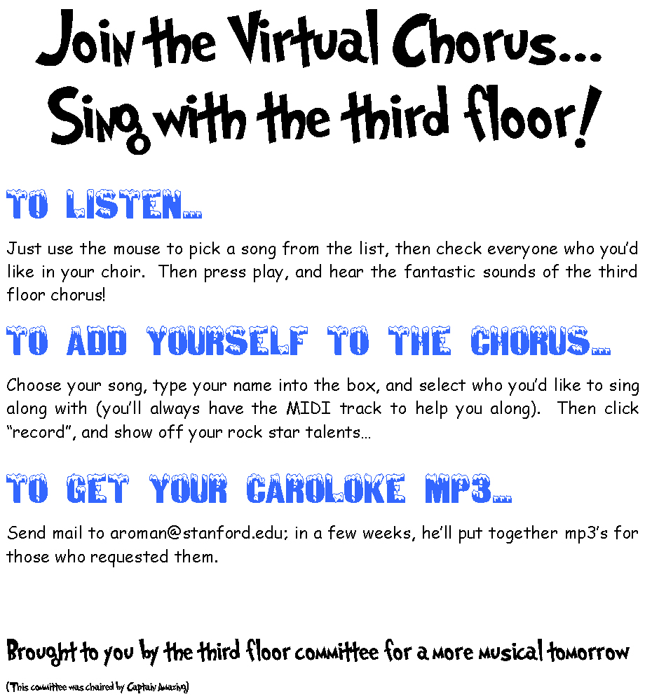 To show off our fantastic musical talents, we've taken some of the third floor's favorites and mixed some subset of the chorus into an mp3 for your listening pleasure: