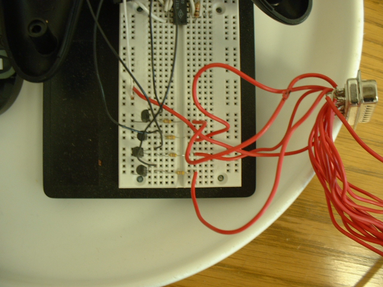 The software expects the reverse, right, left, and forward switches to be on the parallel port's data 1, 2, 3, and 4 pins, respectively. Data 0 got left out because it was mean to the other children on the playground. If you left enough wire between the components and the DB-25 connector, you can plug the whole mess right into the parallel port. I like to use an extension cable so I'm less likely to knock things out of my breadboard in the heat of my excitement about driving an RC car with my feet. |