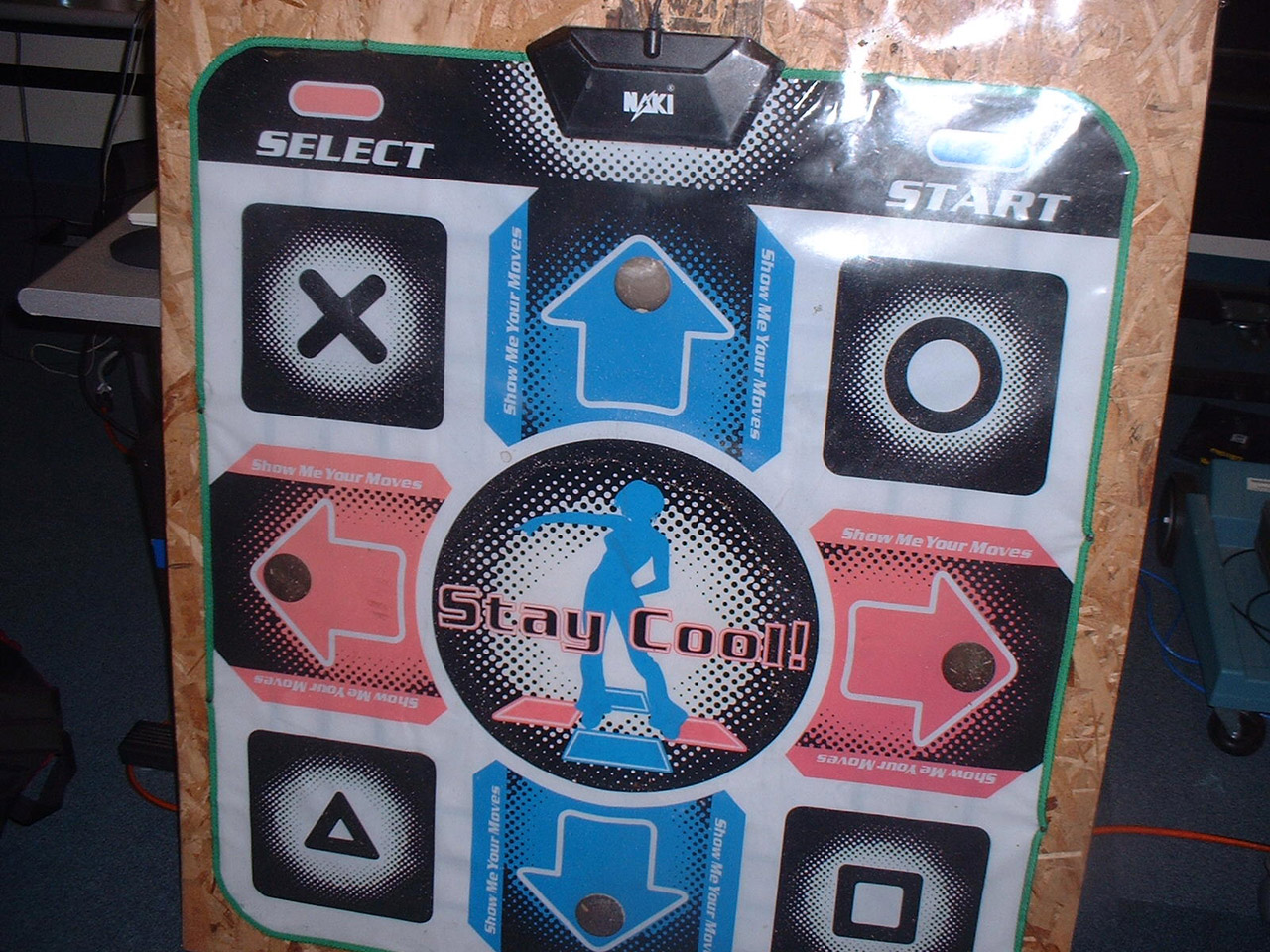 A Dance Dance Revolution pad. I recommend buying one of the soft PlayStation pads, which run about $20, and nailing it down to a big piece of plywood, as is illustrated in the image to the left. The soft pads tend to slide around and/or rip apart without support, and the hard pads are expensive. |