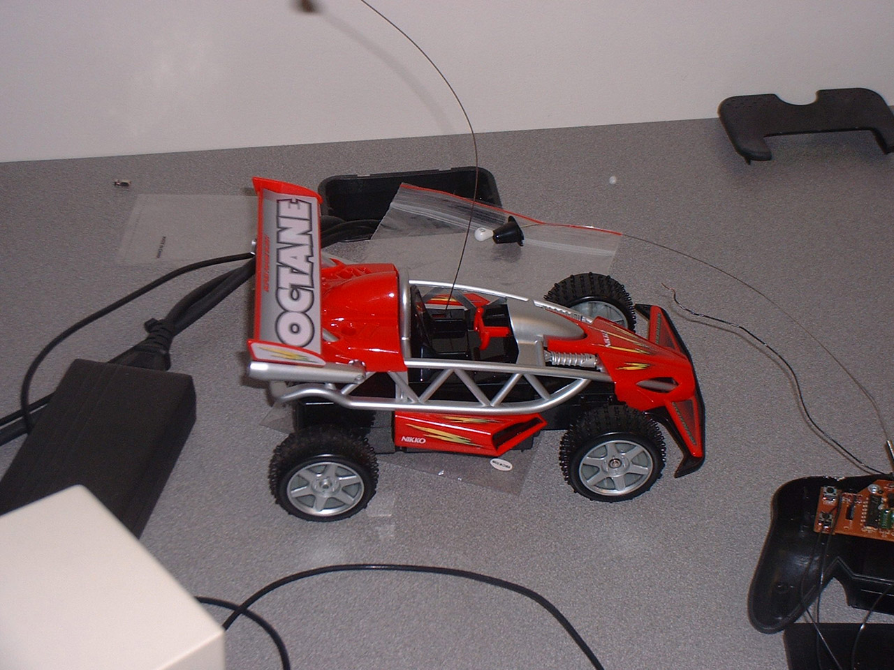 A cheap-ass RC car... the kind that actually has no analog steering, just four switches for forward, back, left, and right. This includes just about any car you get for $20 or less. I went with the fabulous Nikko Octane. |