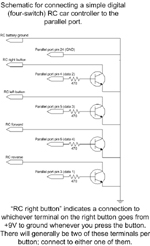 The general approach taken here is to use the parallel port to flip the switches in the RC controller, thereby avoiding all the radio stuff. A few transistors are required to help the 3.3V parallel port pull down some pins on the 9V RC car controller.