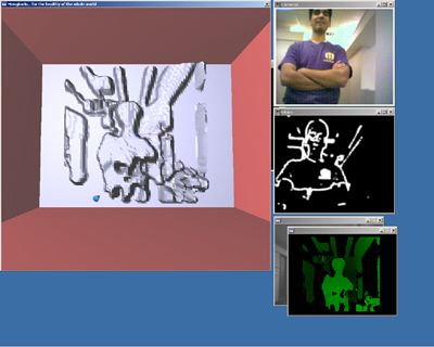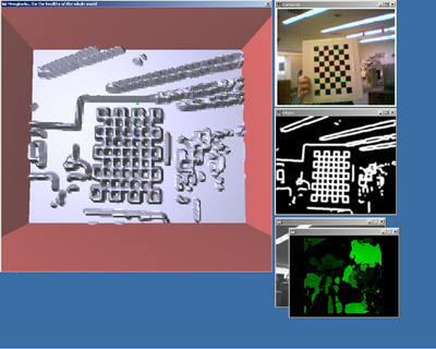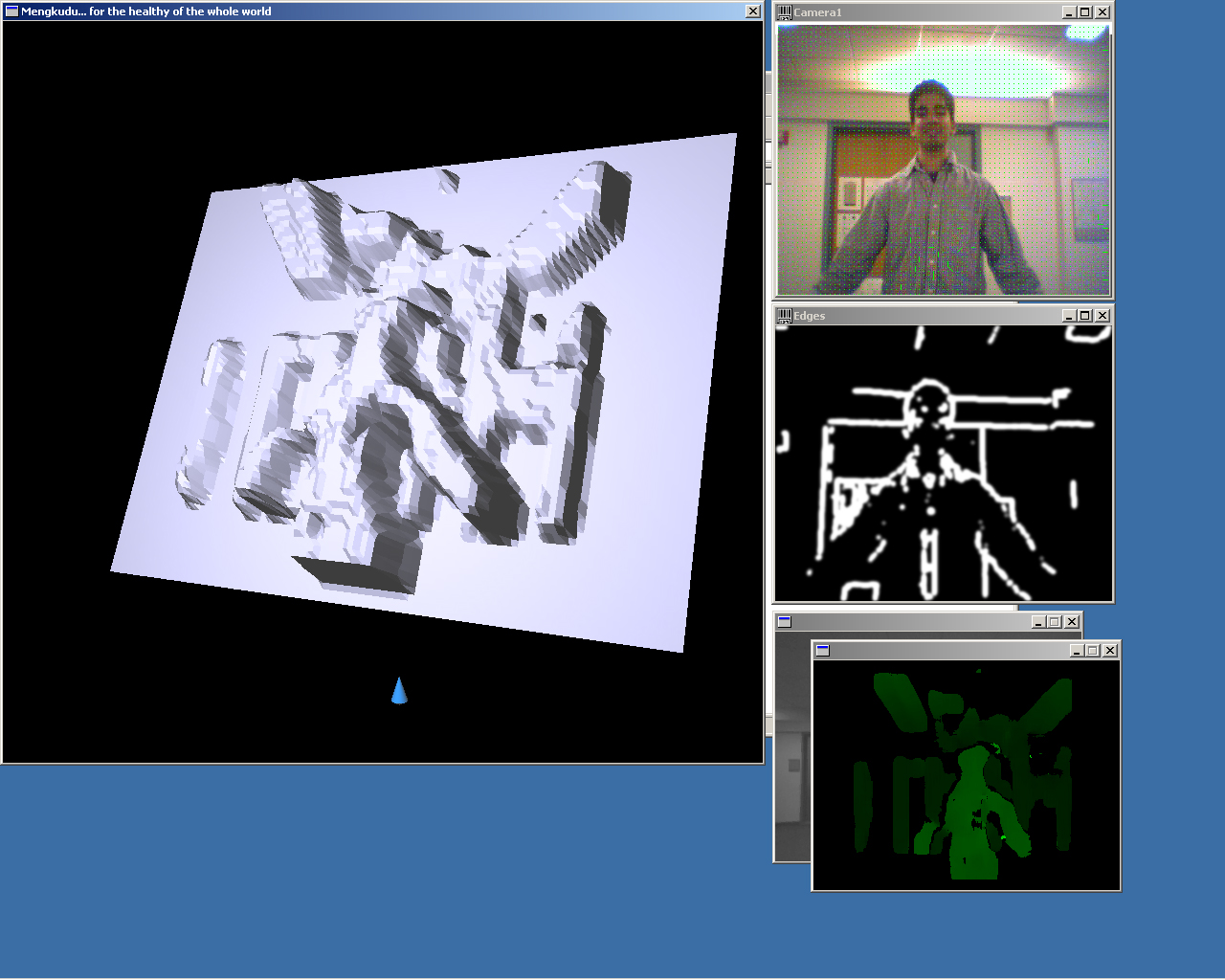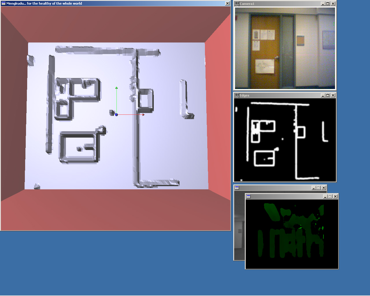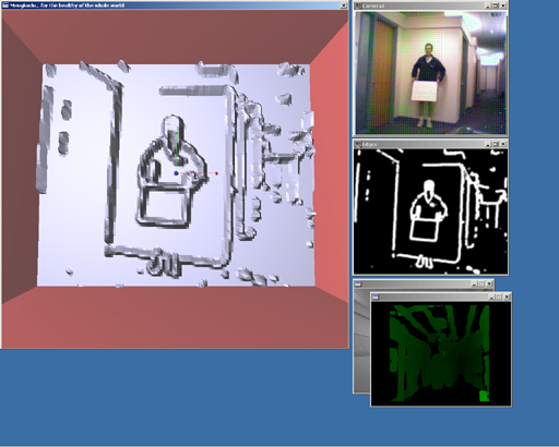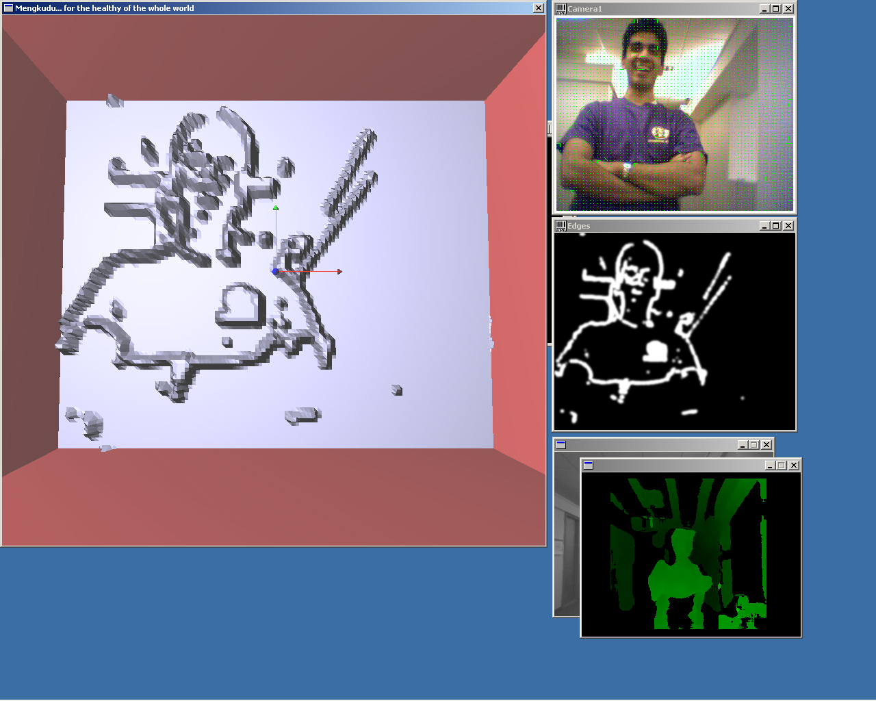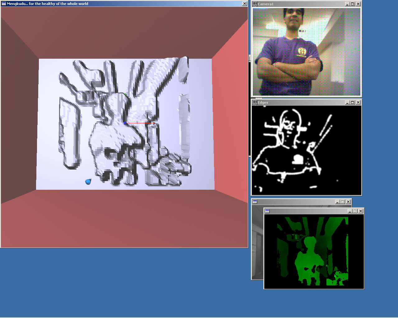 This is a complete screenshot of the system in operation, showing the GL representation of the rendered scene, the real-time stream from the webcam with optic flow vectors superimposed on the image (updated in real time) (although jpeg compression makes the flow vectors difficult to see), the edge-detected image, and the disparity map generated in real-time from the stereo camera. The occluded window behind the disparity map contains the real-time video feed from the stereo camera. The GL window is currently displaying a rendering of the edge-detected image, which - as always - was simultaneously output on the haptic device. The sign that you can't read in a web browser says "I enjoy Mengkudu Juice", a reference to the original title for this project.