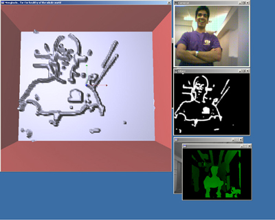 We are able to successfully capture and render arbitrary edge maps and disparity maps, and to convey optic flow information via sound. Although the Web does not currently allow us to let you reach out to your monitor and feel our force-feedback, the OpenGL representations shown below are entirely consistent with the force-feedback that the user feels when operating the Phantom.