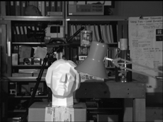 We first demonstrate a scene that was generated from a file, rather than from live video. This is a popular test image in the stereo vision community; we have used a stereo image pair (first row) to generate a disparity map (second row, brighter objects are closer to the camera) and render it in OpenGL (third row). As discussed above, the mesh was simultaneously rendered on the haptic feedback device. The red walls you see outside the image constrain the user to the surface of the image, which prevents the user from getting "lost" during haptic exploration.